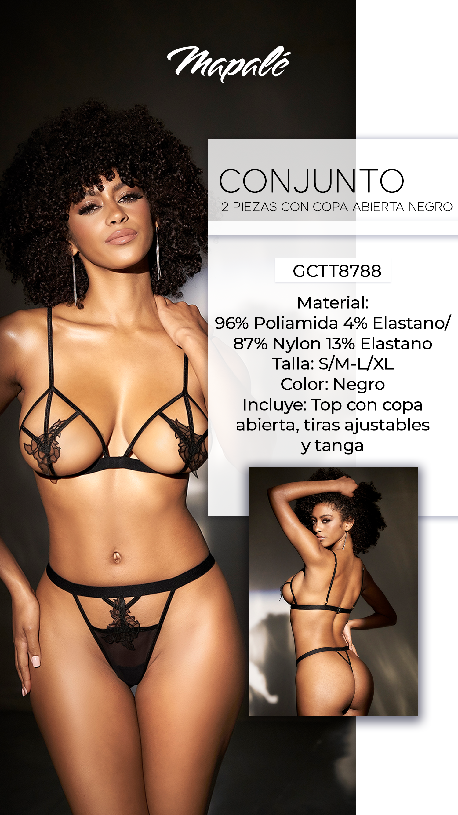 - Incluye: Top con copa abierta, tiras ajustables y tanga.